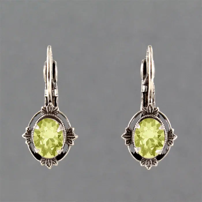 features a hand set Swarovski Austrian crystal 8mm x 6mm oval stone in a frame style setting